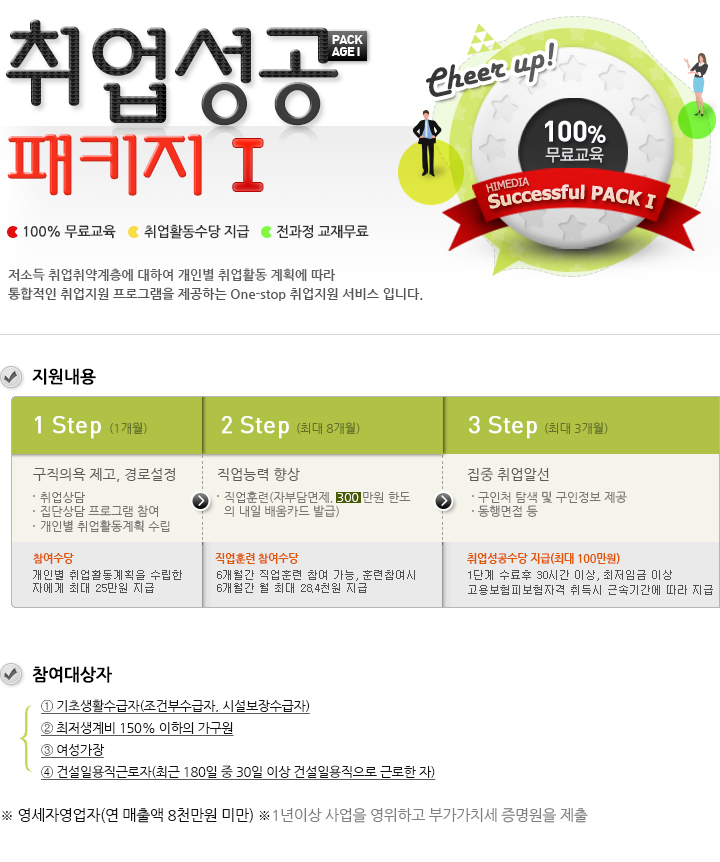 [국비무료] 취업성공패키지 I 2013.04.22 참여대상자 ① 기초생활수급자(조건부수급자, 시설보장수급자) ② 최저생계비 150% 이하의 가구원 ③ 여성가장 ④ 영세자영업자(연 매출액 8천만원 미만) ⑤ 건설일용직근로자(최근 180일 중 30일 이상 건설일용직으로 근로한 자)